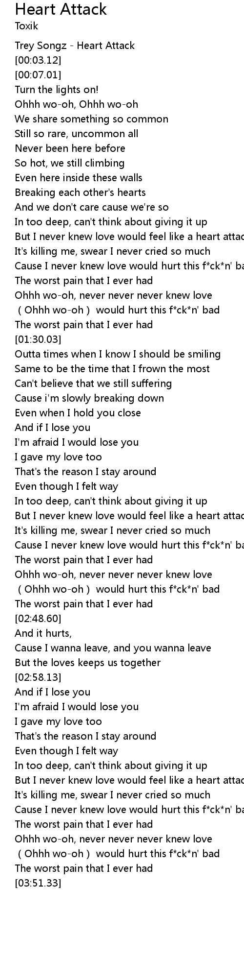 Turn the lights on! Ohhh wo-oh, Ohhh wo-oh We share something so common Still so rare, and I'm in awe Never been here before . Heart Attack Lyrics Trey Songz are a topic that is being searched for and appreciated by netizens today. You can Get the Heart Attack Lyrics Trey Songz here. Get all royalty-free picture. Trey Songz- Heart Attack Lyrics, No copyright intended*** ***I do not own Song*** Like&Subscribe Thanks4Watching:).